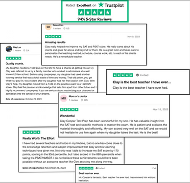 Forty hours of one-on-one tutoring with four-time perfect scorer Clay Cooper in our interactive online teaching platform. Simply the best SAT instruction available anywhere.